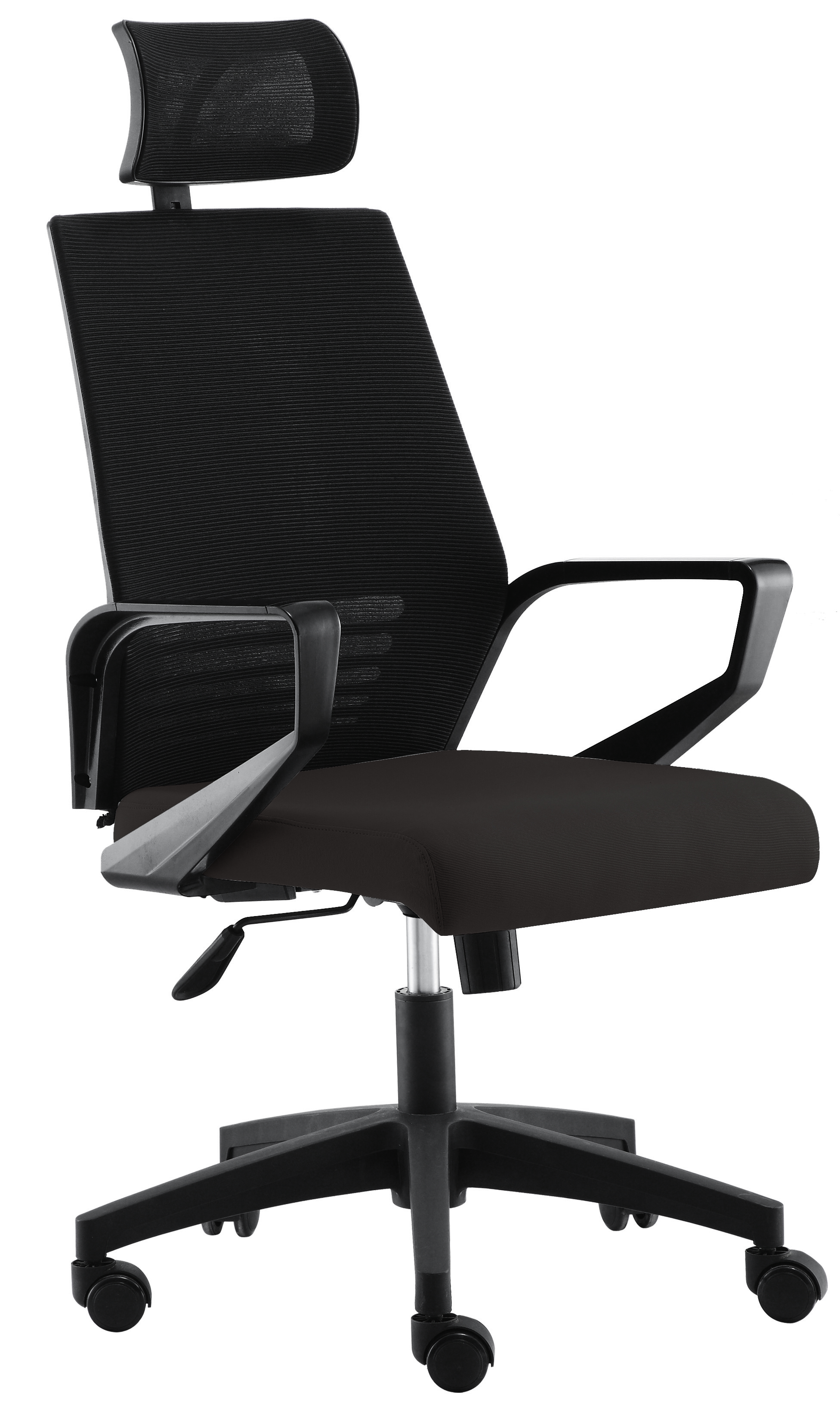 *Respaldo en malla negra con marco en PP con fibra de vidrio *Asiento en tela NEGRA *Descansabrazos fijos en PP *Mecanismo sencillo de reclinación con ajuste de tensión *Cabecera ajustable en altura *Pistón grado 4 *Base de nylon con rodines 55mm